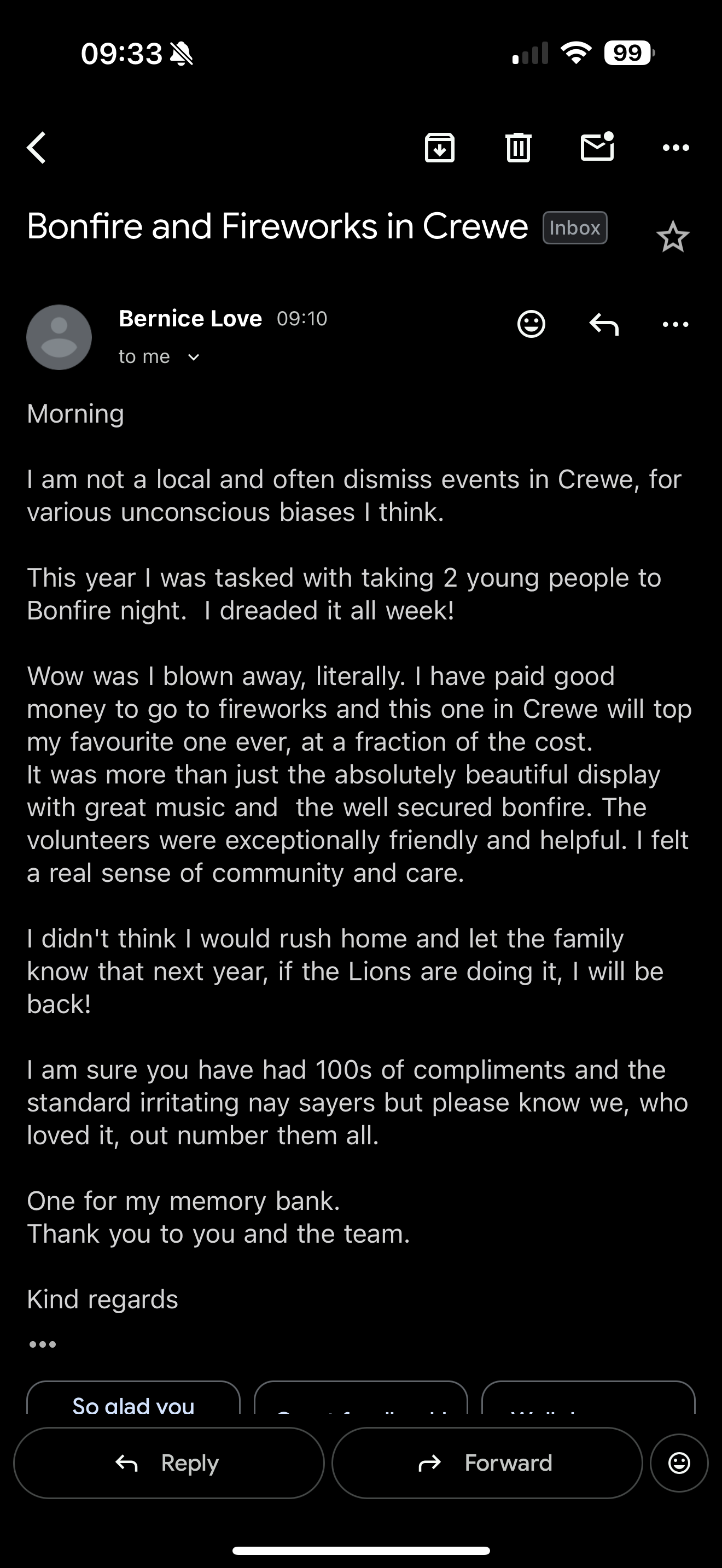 The event is offers a fun evening for the whole family as well as offering a safe place for neurodiversity with low noise fireworks .