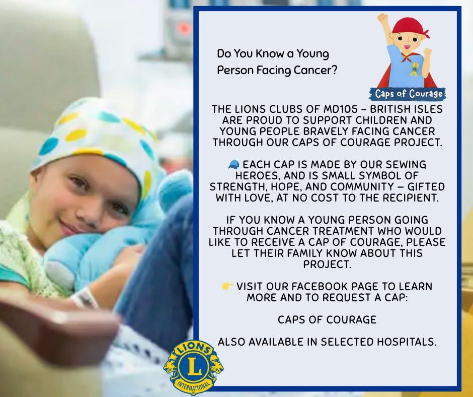 Caps of Courage is part of that mission. By uniting volunteers to knit, crochet, and sew handmade caps, Lions are helping to bring warmth, confidence, and smiles to children and young people affected by cancer.