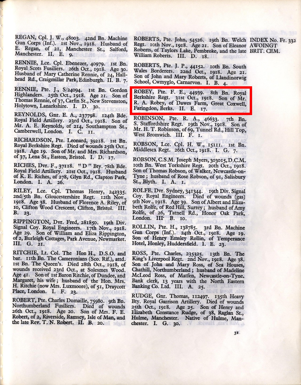 Killed in Action.- It is particularly sad now that hostilities have ceased to have to record the death of yet another young and highly respected inhabitant of the village in the person of Lance-Corpl. F. E. Robey, 8th Royal Berks Regiment, who fell in action on October 31st. Lance-Corpl. Robey, who was only 19 years of age, was the eldest son of Mr. and Mrs. R. A. Robey, and joined the army on reaching militray age in May of last year. Needless to say the deepest sympathy is expressed with the relatives and friends in their sad loss.