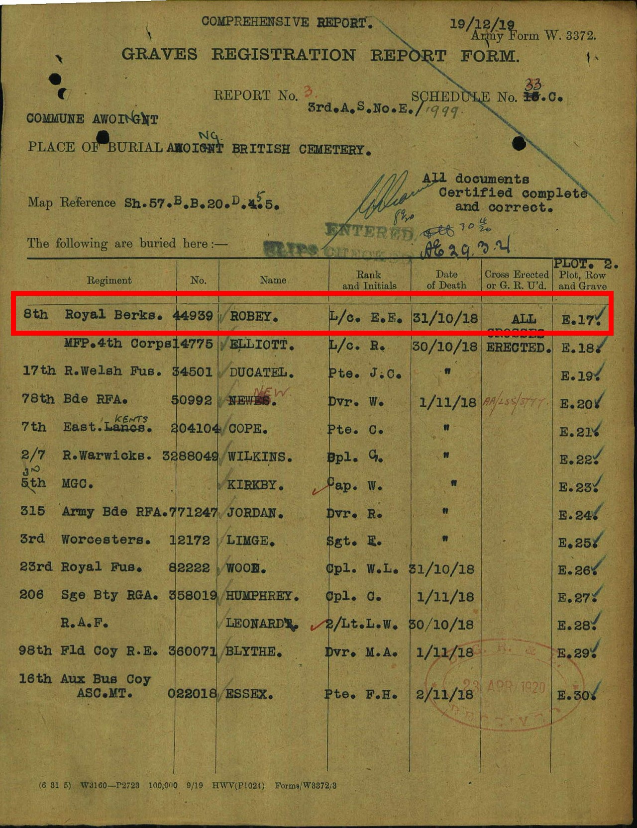 Frank Ernest Robey died from his wounds on 31st October 1918, less than 2 weeks before the Armistice, he was 19 years old. He served with Princess Charlotte of Wales’s (Royal Berkshire Regiment), 8th Battalion. Frank is buried at the Awoingt British Cemetery near Cambrai in Northern France.