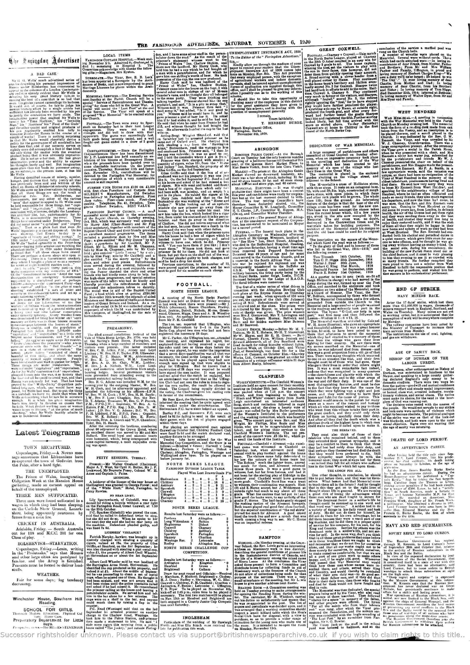 As well as the "Dedication of War Memorial" (below) , on the same page we learn that the day before Coxwell had won away at Charney 5 – 0, goals from Broad and Shilton in the first half, a third from Sharpes before the rout was completed by Hams and a 2nd from Sharpes.