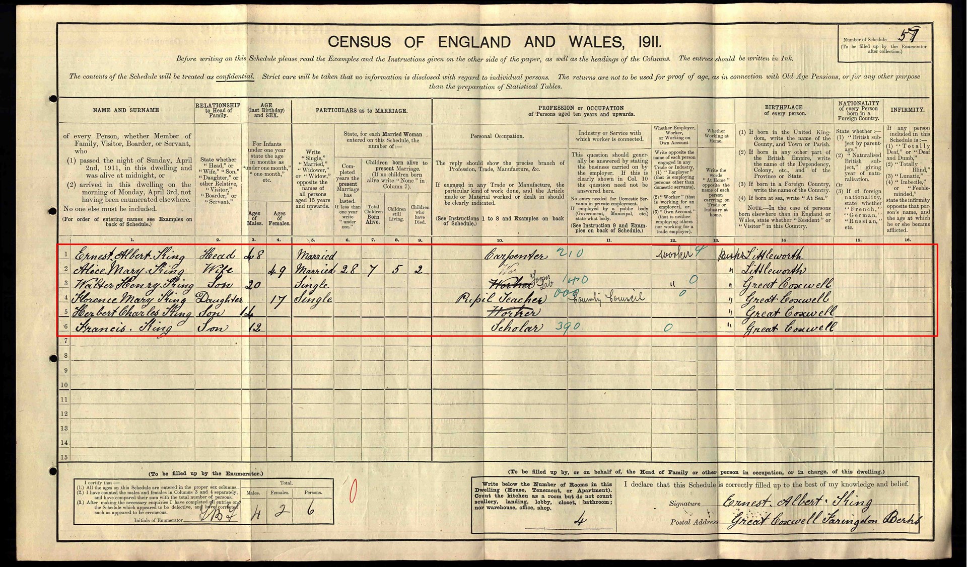 Frederick (1889), Walter Henry (1891), Florence (1894), Francis (1899)