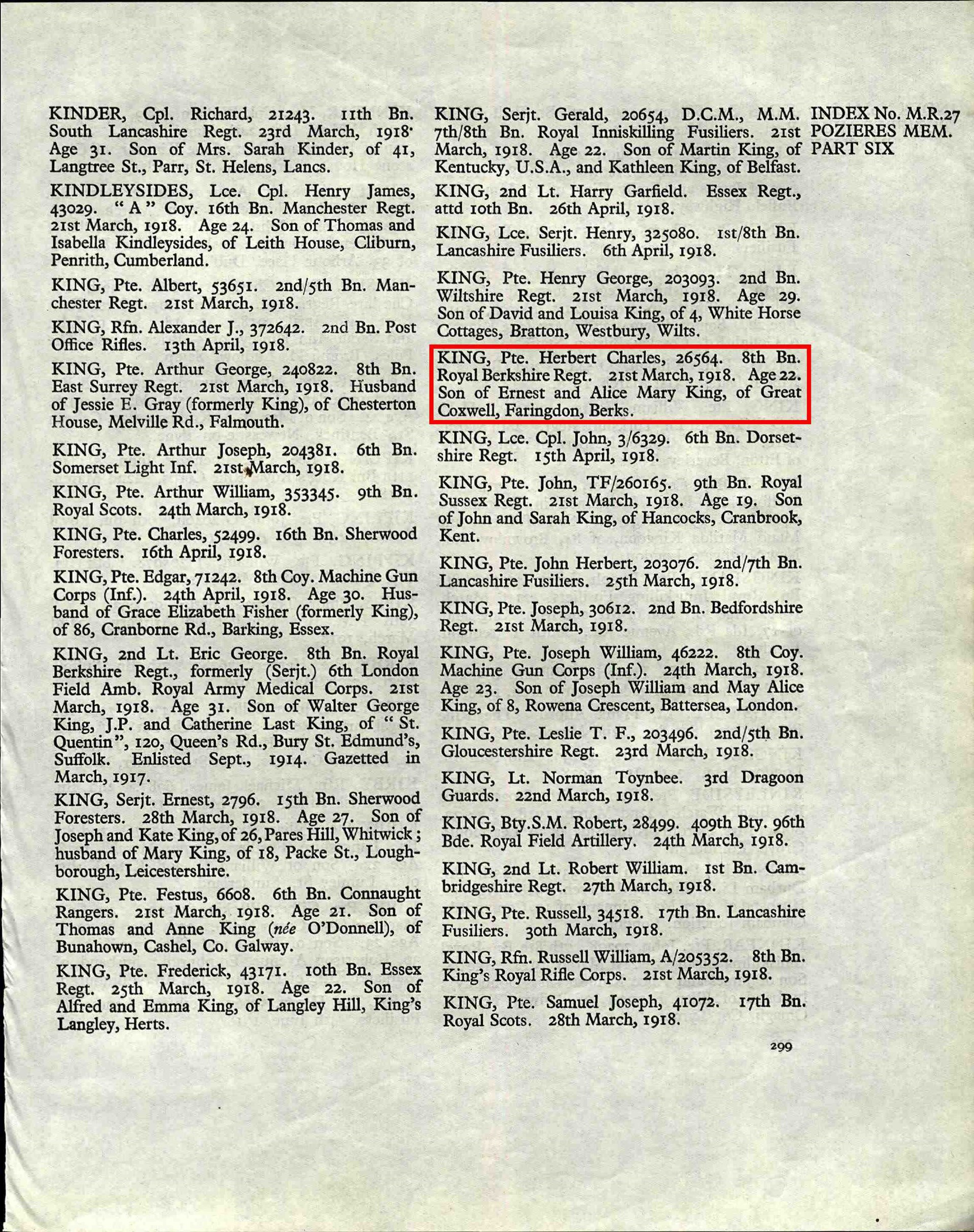 Herbert Charles King died on 21st March 1918, he was 22 years old, he served with the 8th Battalion, Royal Berkshire Regiment. He is one of 14,690 casualties commemorated on the Pozieres Memorial in France.
