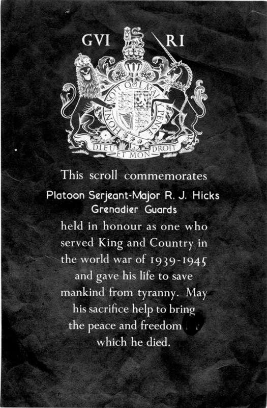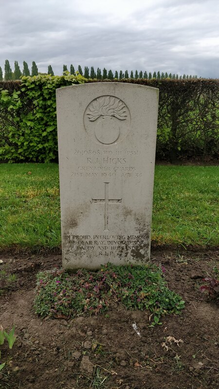 Raymond Hicks died on 21st May 1940, he was 34 years old. He served with 3rd Batallion Grenadier Guards and is buried at Esquelmes War Cemetery in Belgium.
