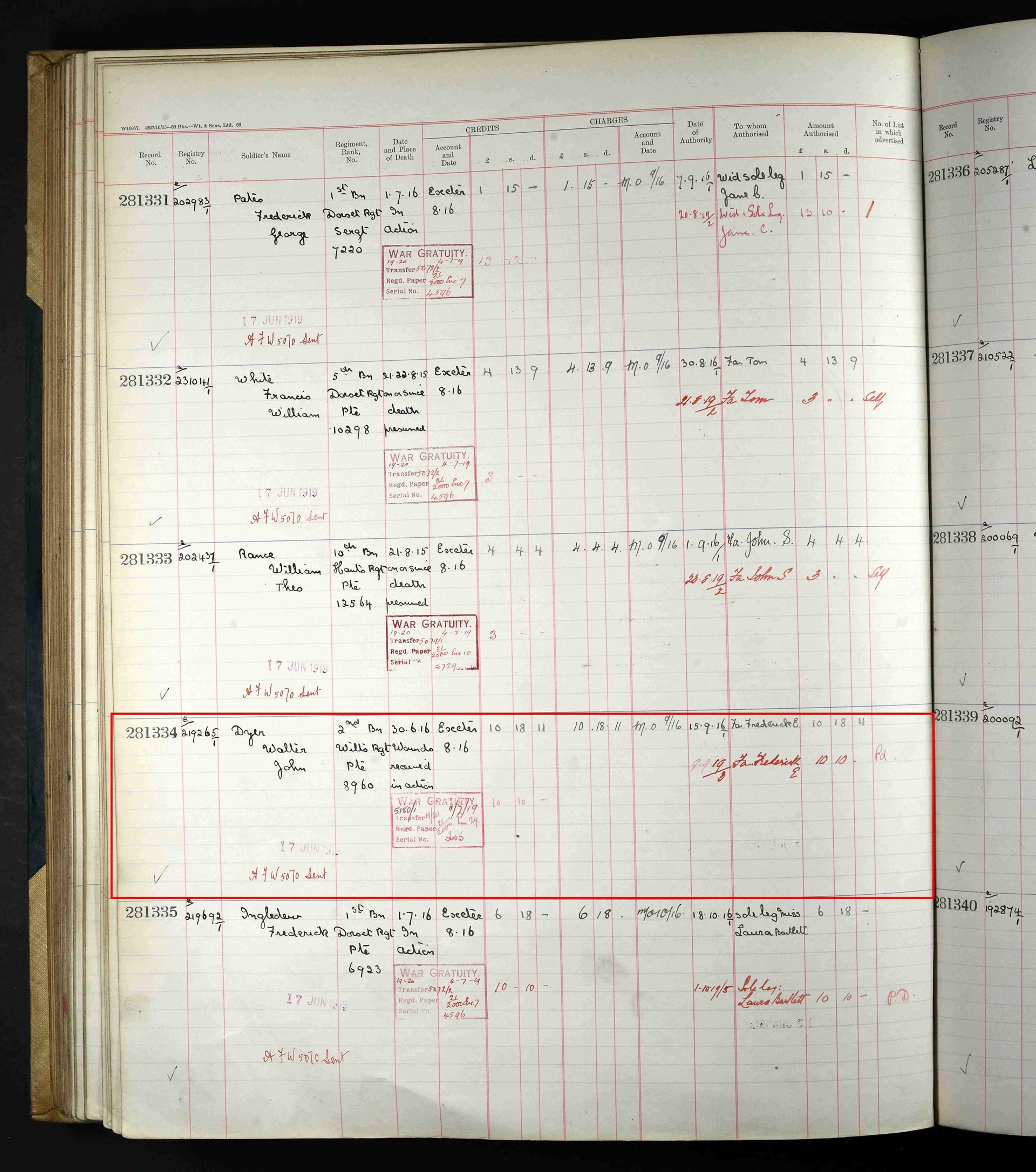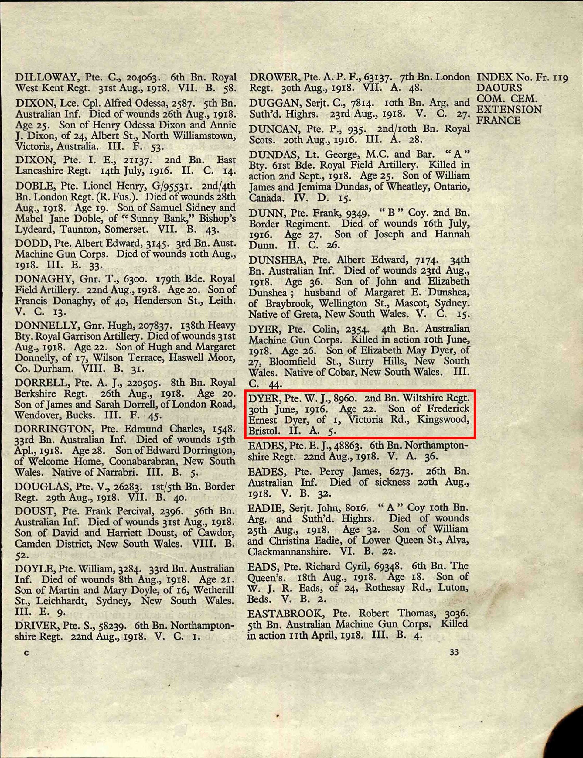 Private Walter John Dyer (2nd Battalion Wiltshire Regiment) died from his wounds on 30th June 1916, he was 22. He is buried at the Daours Communal Cemetery in France.