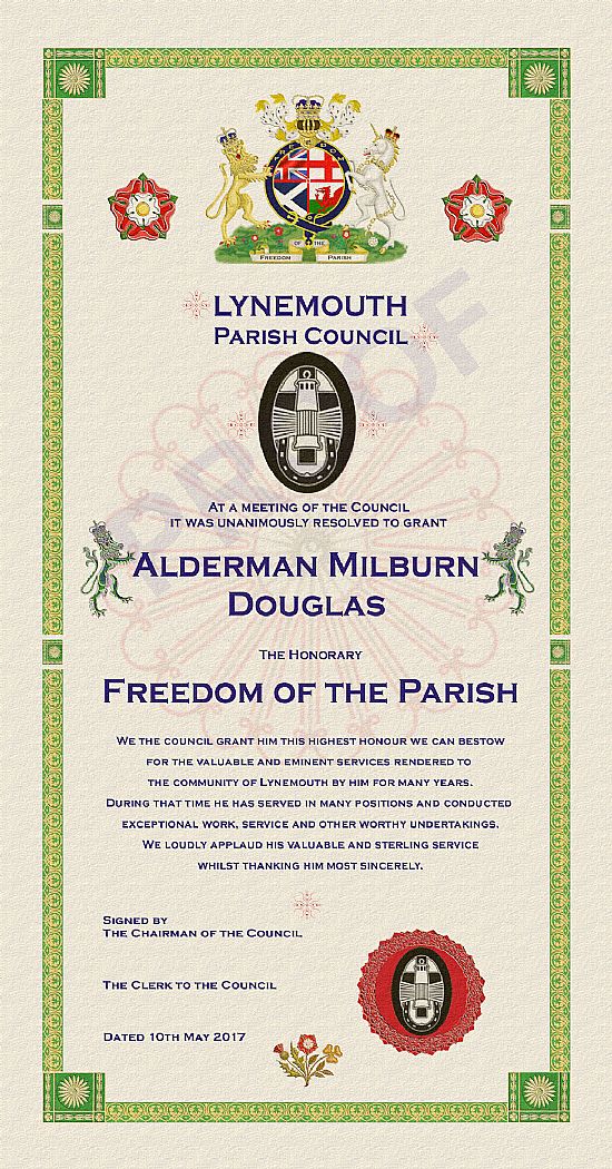 The honorary freeman title confers no powers on the individual. It is entirely ceremonial. The Parish Council officially thanks people who conduct exceptional work, service or other worthy undertakings that benefit their community by presenting them with a Freedom Scroll as a timeless thank you. The scrolls are highly regarded by recipients.