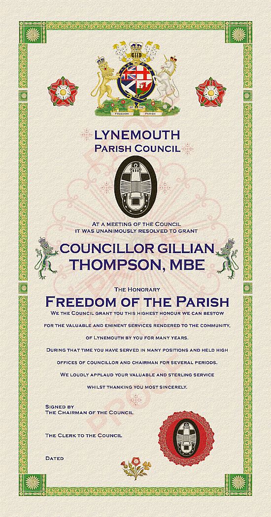 “At a meeting of the Council it was unanimously resolved to grant Councillor Gillian Thompson, MBE, and Mrs Sarah Hannah Williamson, MBE, the Honorary Freedom of the Parish. We the Council grant you this highest honour we can bestow for the valuable and eminent services rendered to the community of Lynemouth by you for many years. During that time you have served in many positions and conducted exceptional work, service and other worthy undertakings. We loudly applaud your valuable and sterling service whilst thanking you most sincerely.”