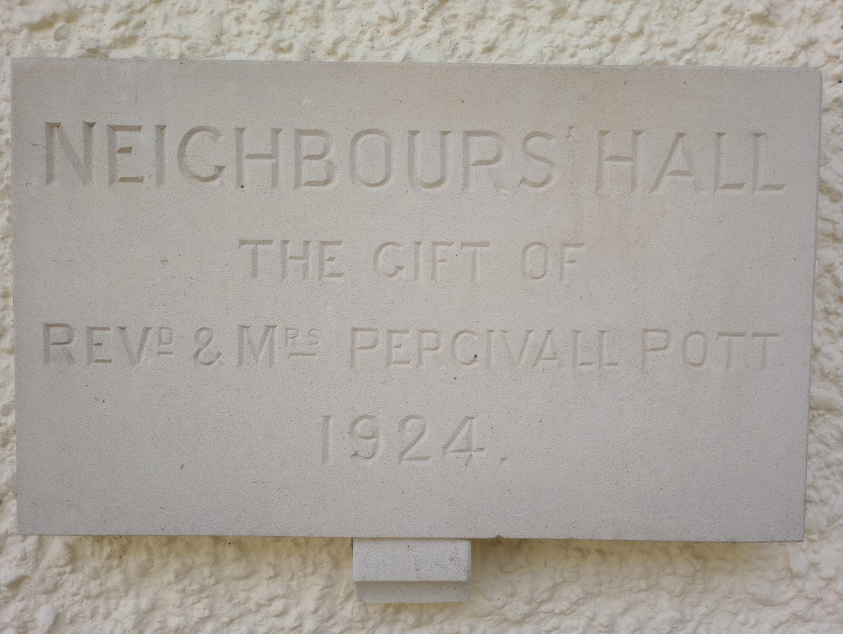 The Hall's existence is entirely down to a Revd A. P. Pott. He was never a Vicar at the nearby St Mary's Church but a resident the Manor (the building which is now Le Manoir aux Quat'Saisons after it was sold to Raymond Blanc in 1984). Revd Pott gifted the land and funded the building for the local community. The stone plaque near to the original entrance states: "Neighbours' Hall. The gift of Revd & Mrs Percivall Pott 1924. " The Committee membership was intended to be entirely representative of the local community with persons from the District Nursing Association, Women's Club, Football Club, Cricket Club and Man's Institute, for example. Revd Pott chaired meetings which were initially held in The Manor. A librarian (for a free library) was one of the earliest appointments. Following Revd Pott's death in 1943 it was agreed that the ownership of the Hall should be transferred to the Oxford Diocesan Board of Finance "to hold the Hall on trust as a place of recreation and social intercourse and other purposes for the benefit of Great Milton and the surrounding district." Further, "the Deed provides that the management and control of the Hall shall be vested in the Great Milton Parochial Church Council.".