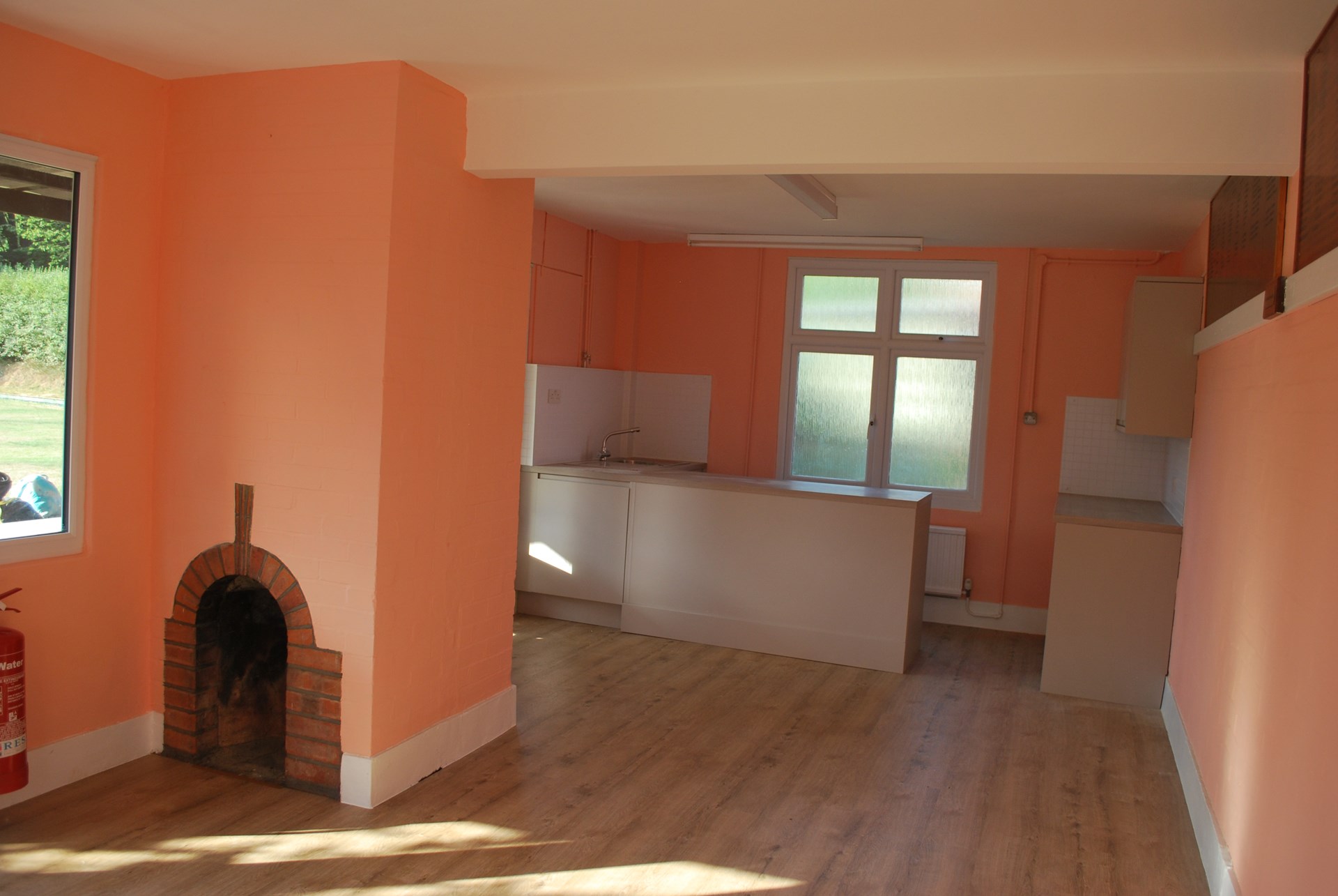 The hall opens onto a large, flat, and fully enclosed outdoor area, formerly a bowling green. This versatile space is ideal for: