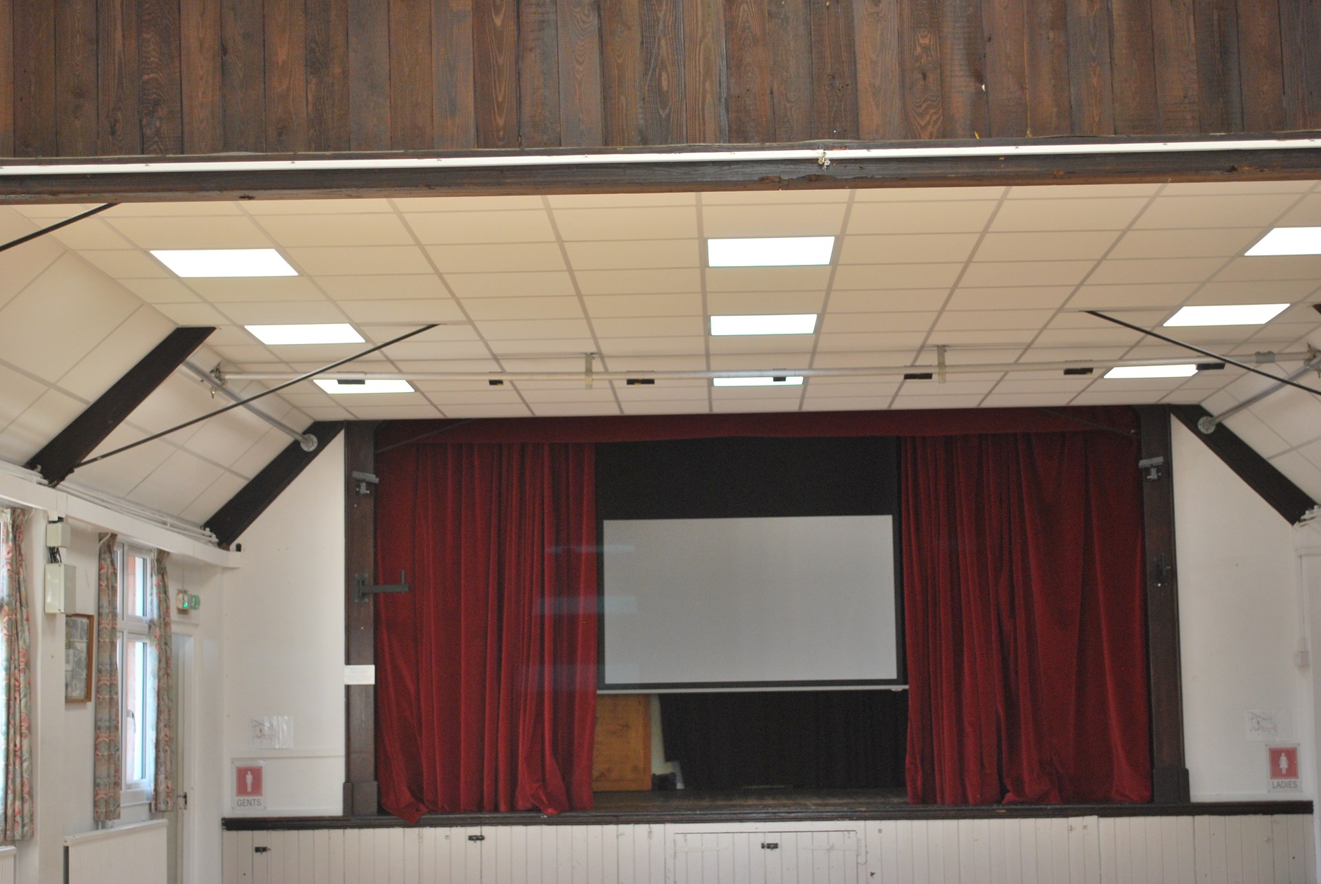 The hall includes a raised stage with curtains and basic stage lighting — perfect for performances, talks, or presentations.