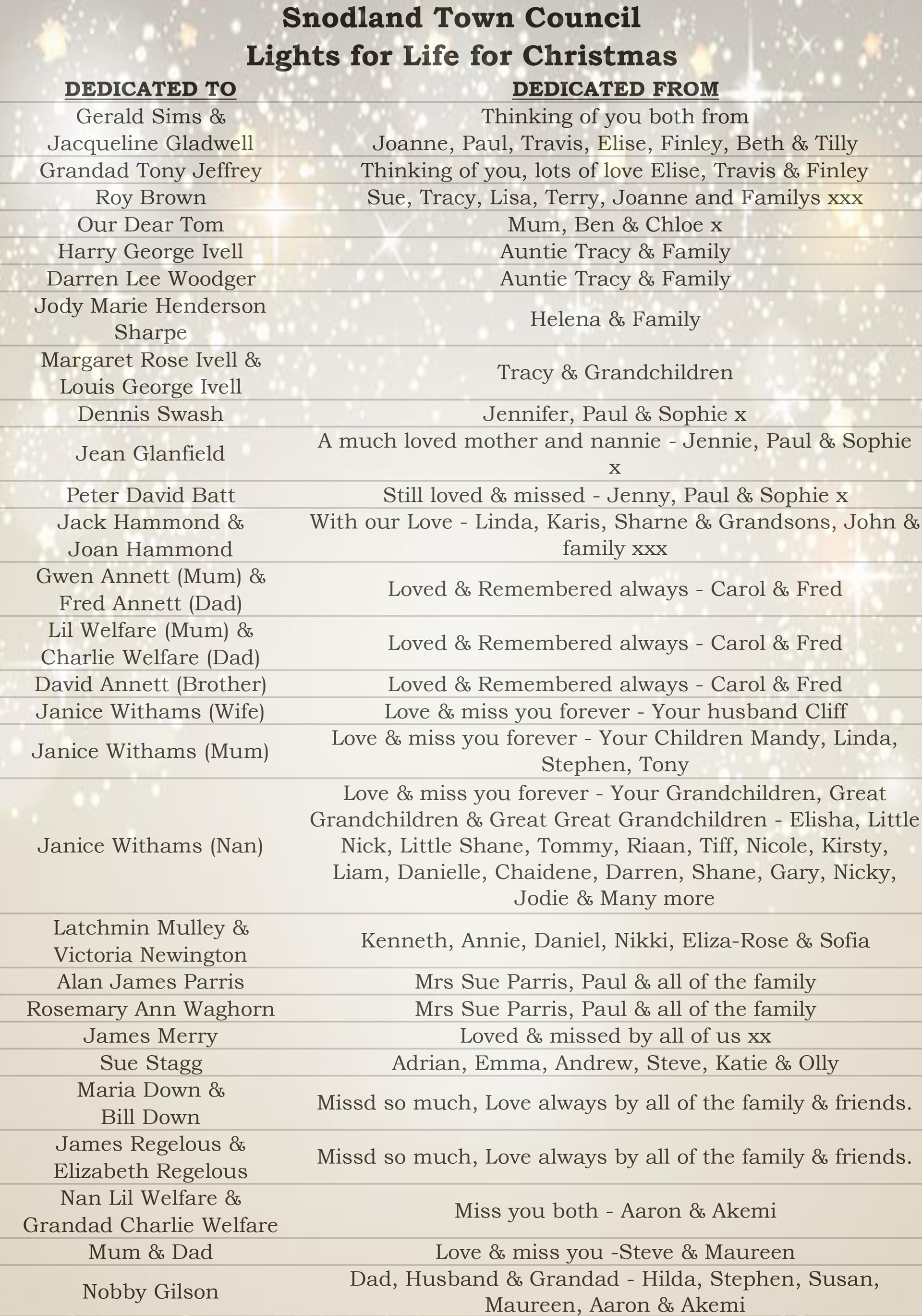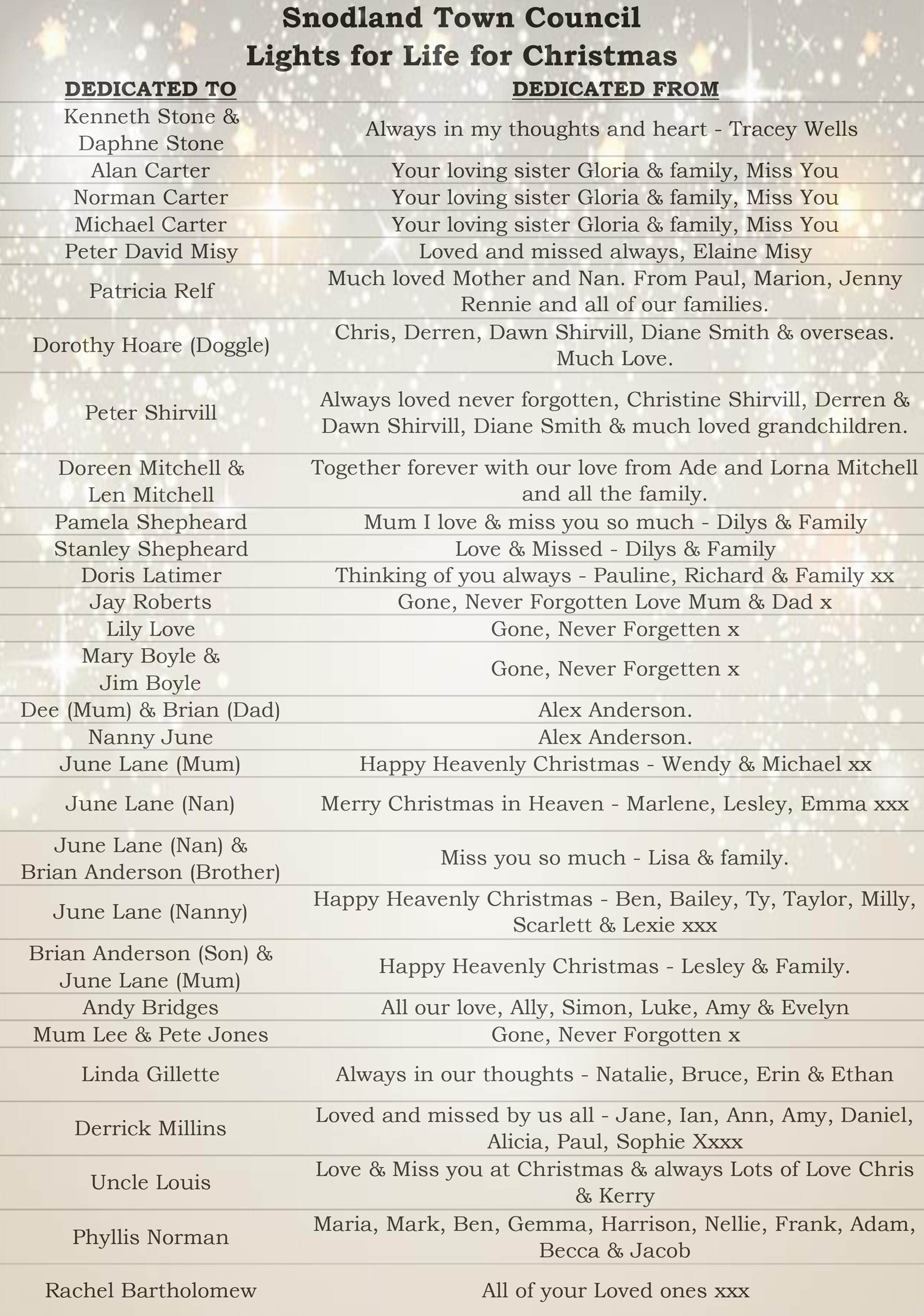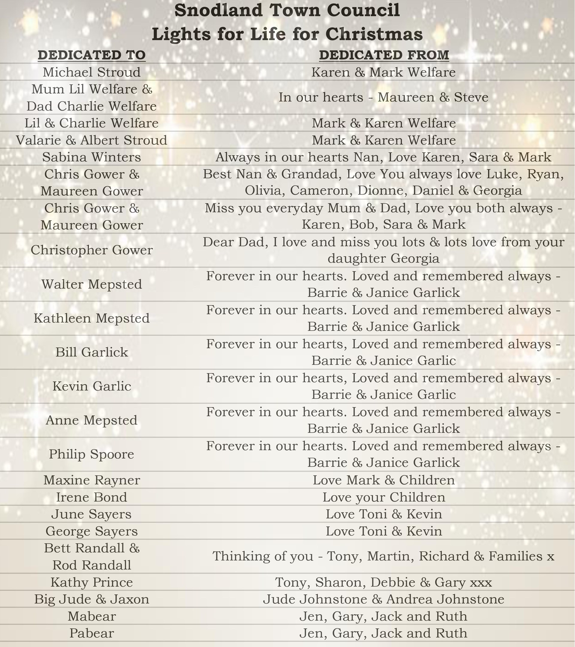 We would like to give you the opportunity of remembering a loved one at this special time of year. For just £2.00 each you can dedicate a Star on the Light for Life Christmas Tree sited in the town centre opposite the car park. A list of those remembered will be produced and displayed around Snodland Car Park for the time that the lights are on.