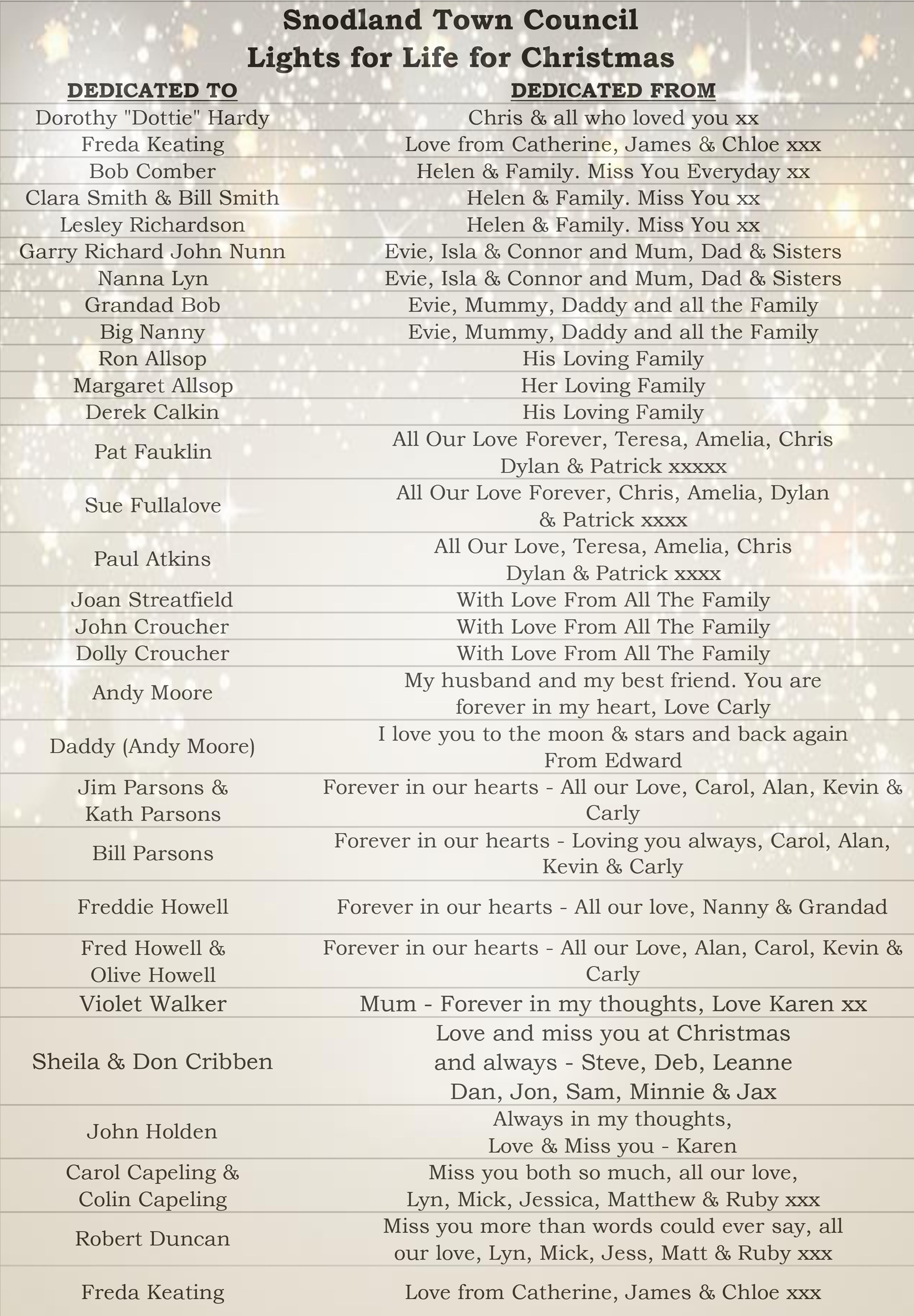 Lights for Life Dedication 2025 List