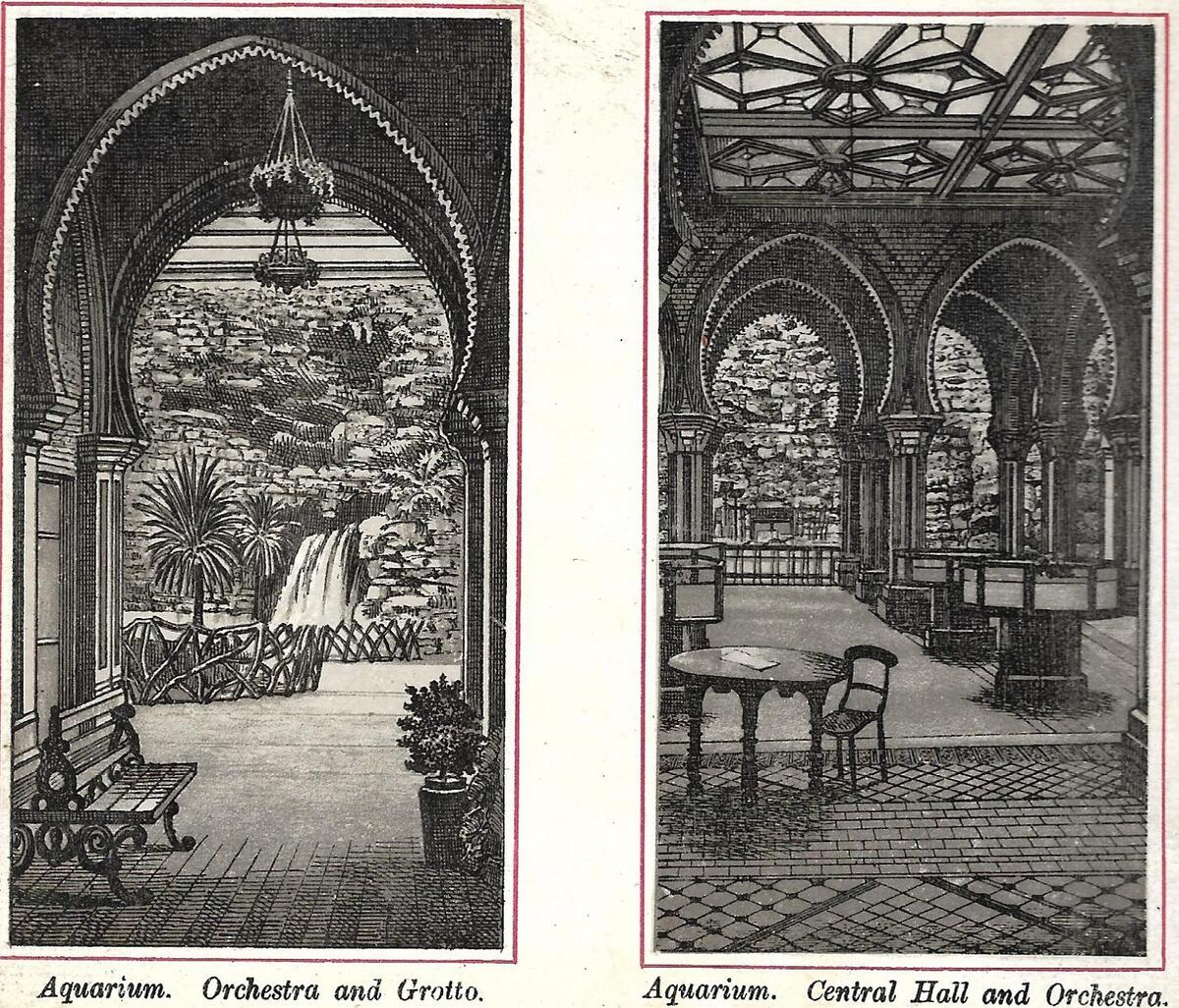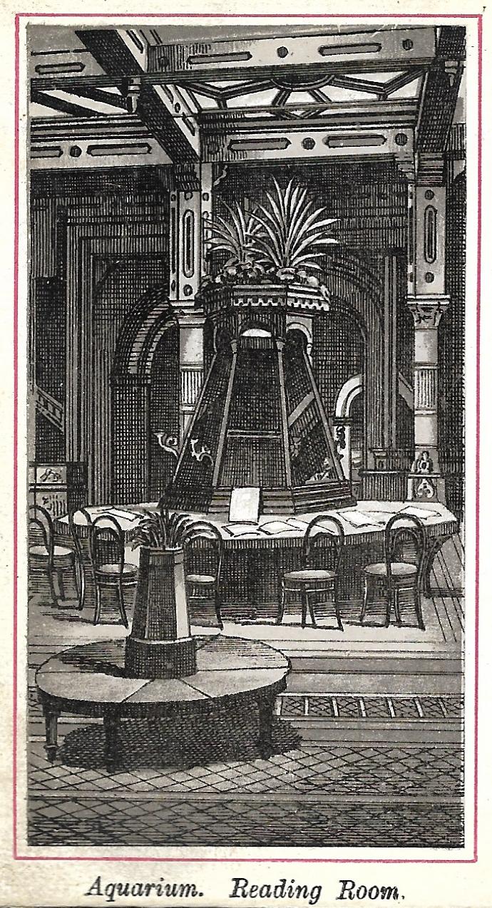 The lithographs below are taken from the Royal Aquarium Album of Scarborough produced in the 1880’s. There are 24 pictures in the album, not all of them of the Aquarium (officially the People’s Palace and Aquarium). However they are the first pictures I have found that really show the scale and opulence of the building.