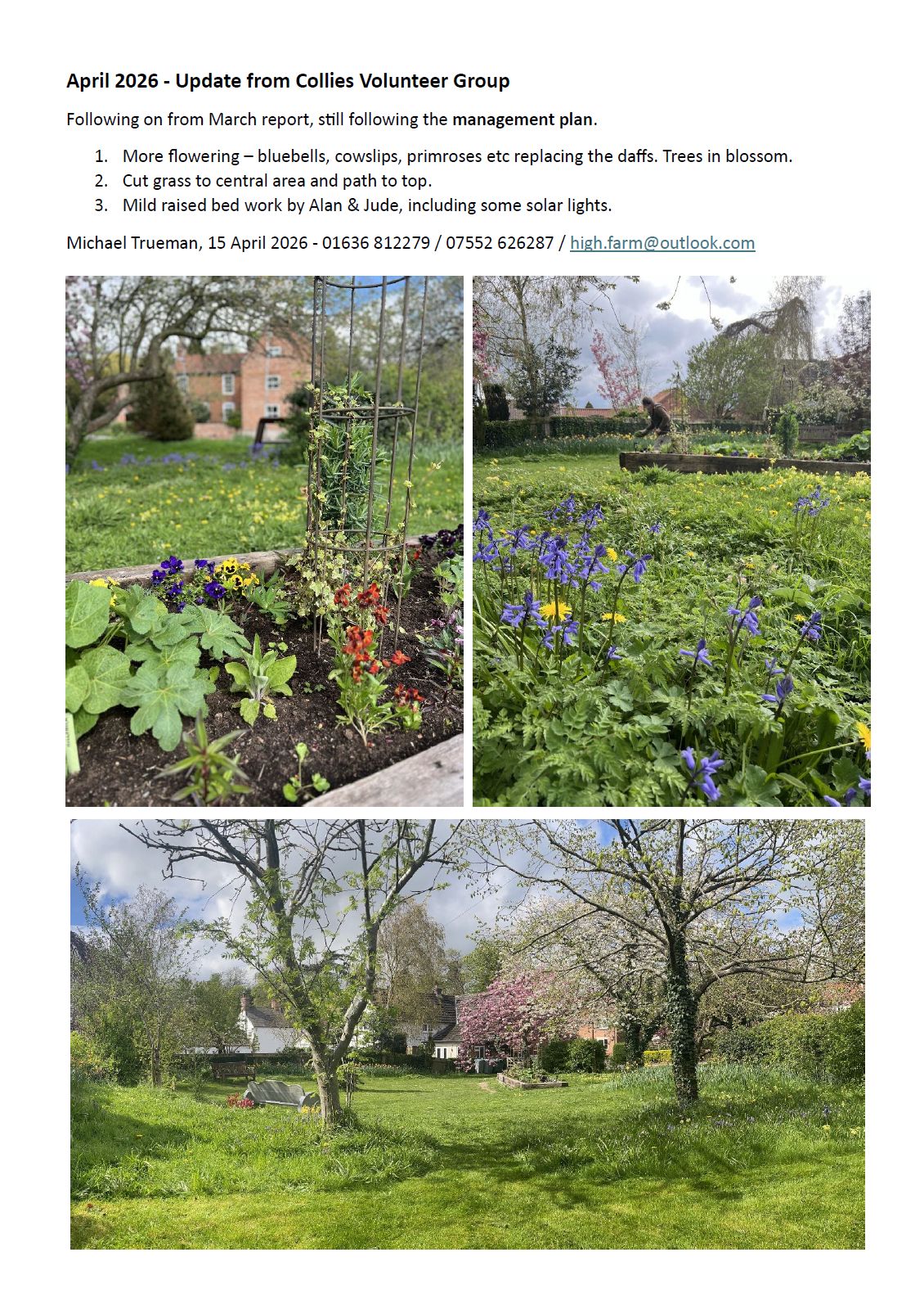 The Collies Garden has been managed by the 'Collies Volunteer Group' (made up of Upton villagers) on behalf of the Upton Parish Council since June 2023. We present summary progress reports to the Parish Council, to coincide with PC meetings.